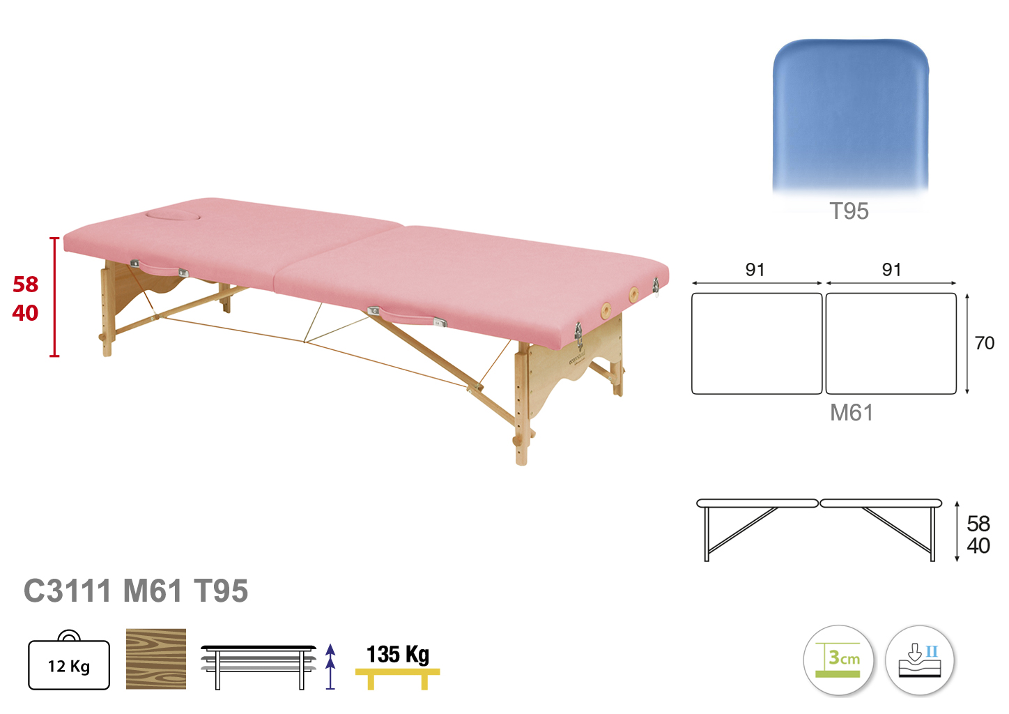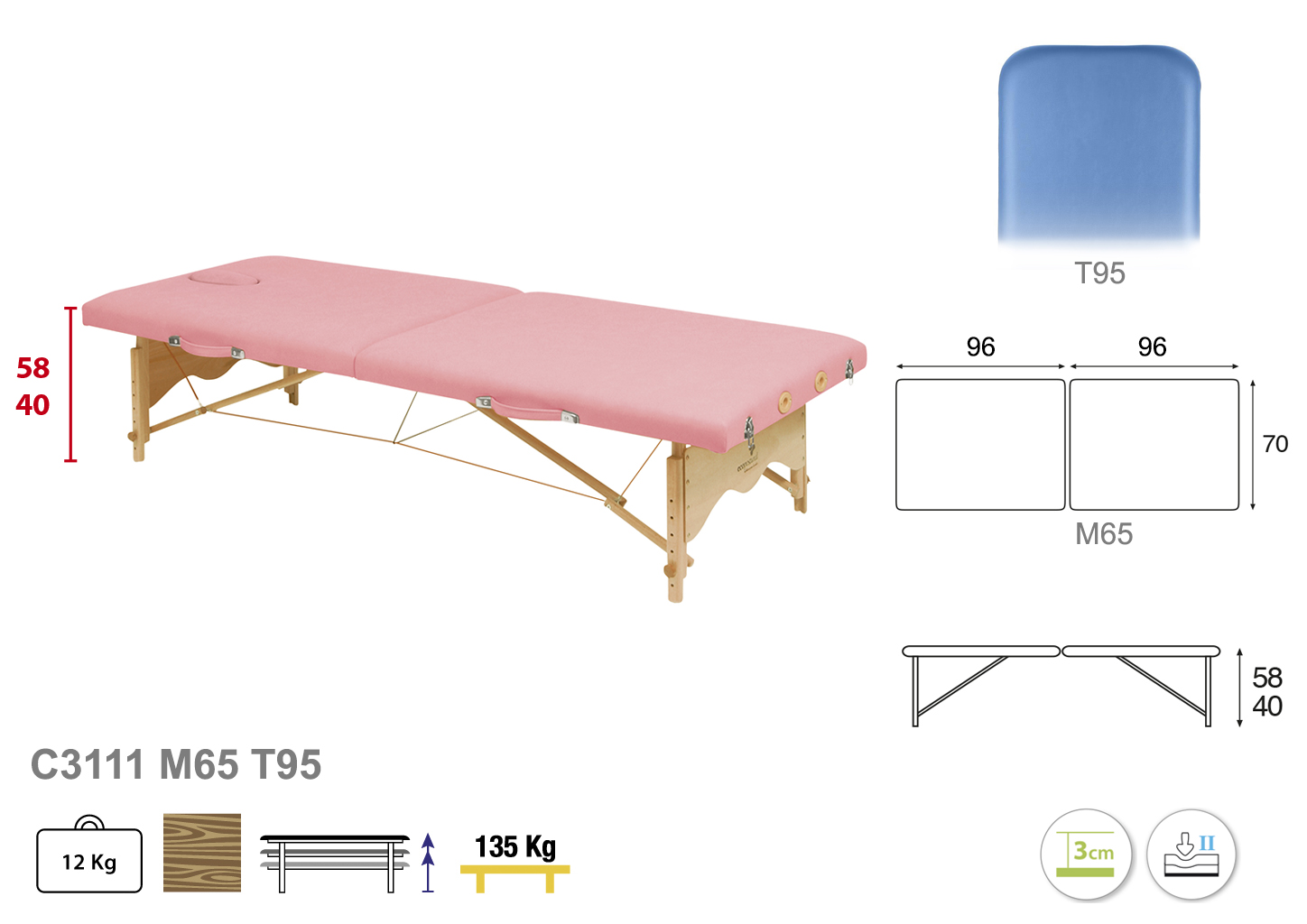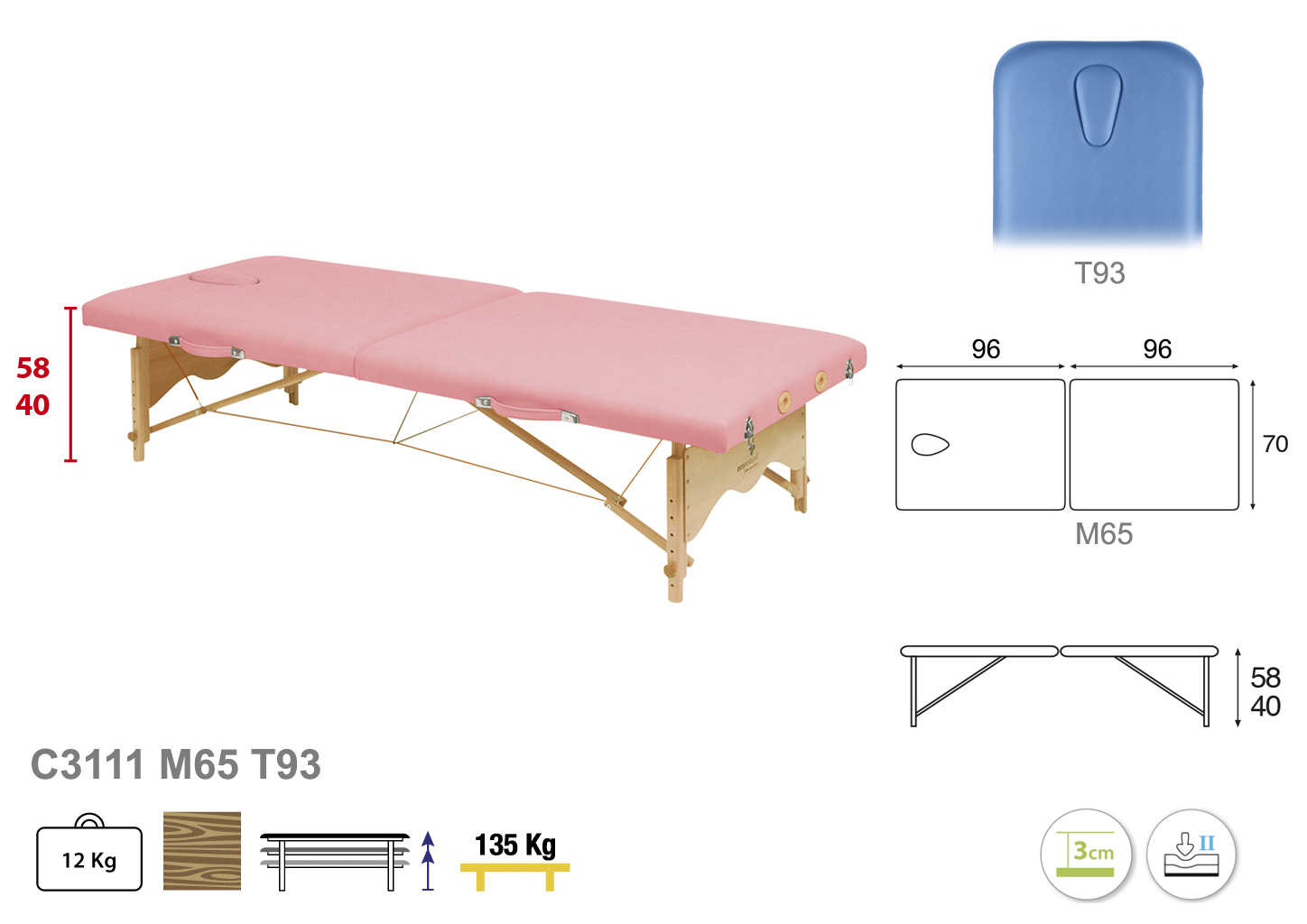Camilla ecopostural plegable de dos cuerpos con estructura de madera. Ancho: 70 cm. Largos disponibles: 182 cm y 192 cm. Altura regulable entre 40 y 58 cm. Disponible con o sin tapón facial. Posee una firmeza media con espuma de 3 cm de grosor.