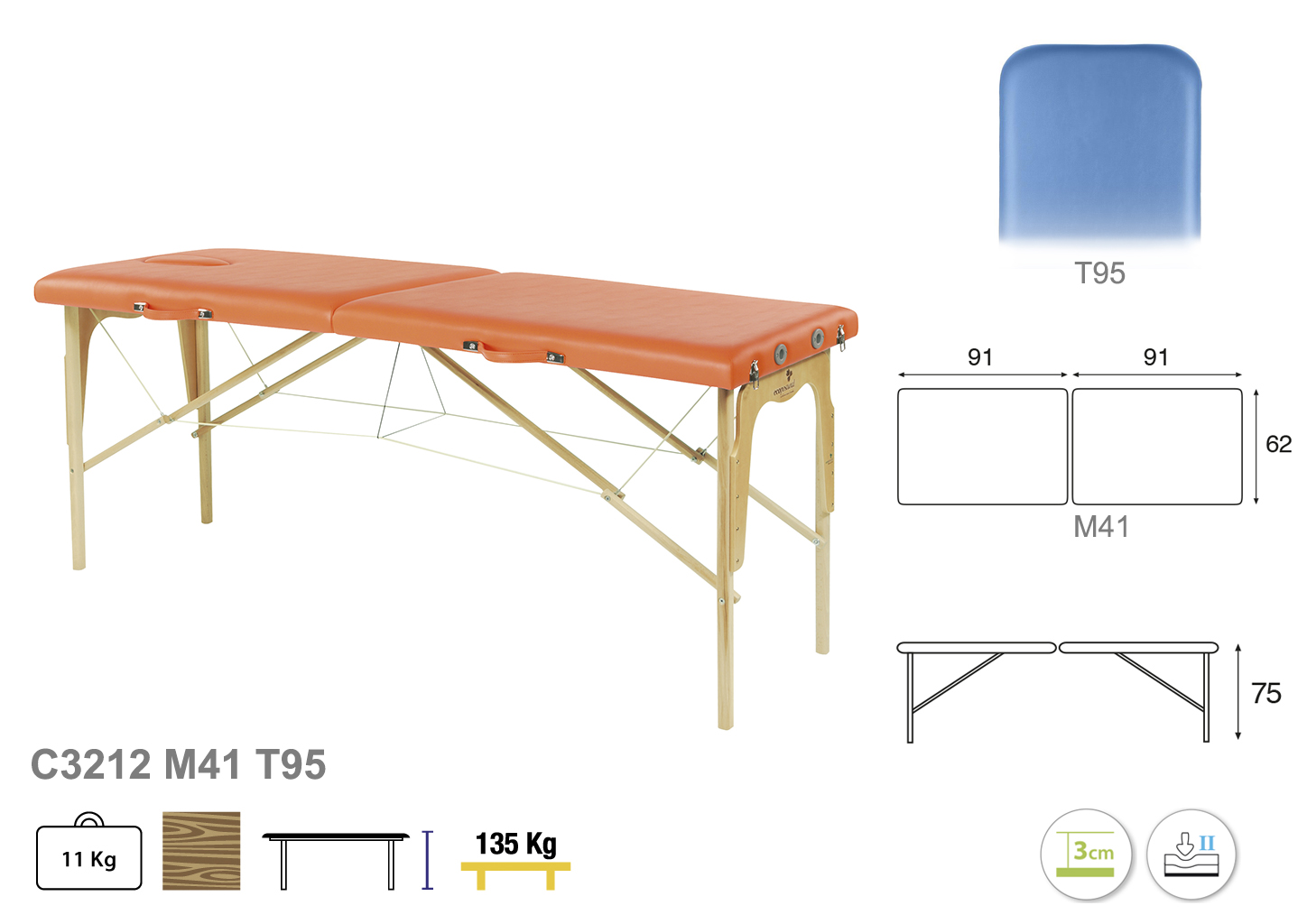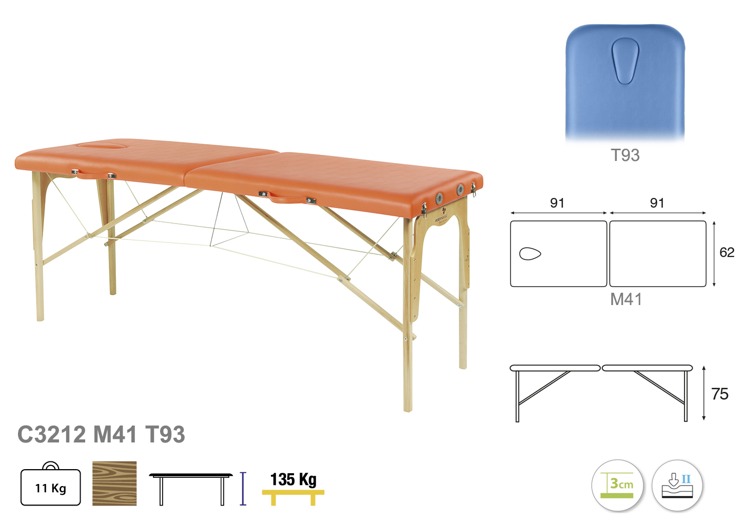 Camilla ecopostural plegable de dos cuerpos con estructura de madera. Ancho: 62 cm. Largo 182 cm. Altura fija de 75 cm. Disponible con o sin tapón facial. Posee una firmeza media con espuma de 3 cm de grosor.