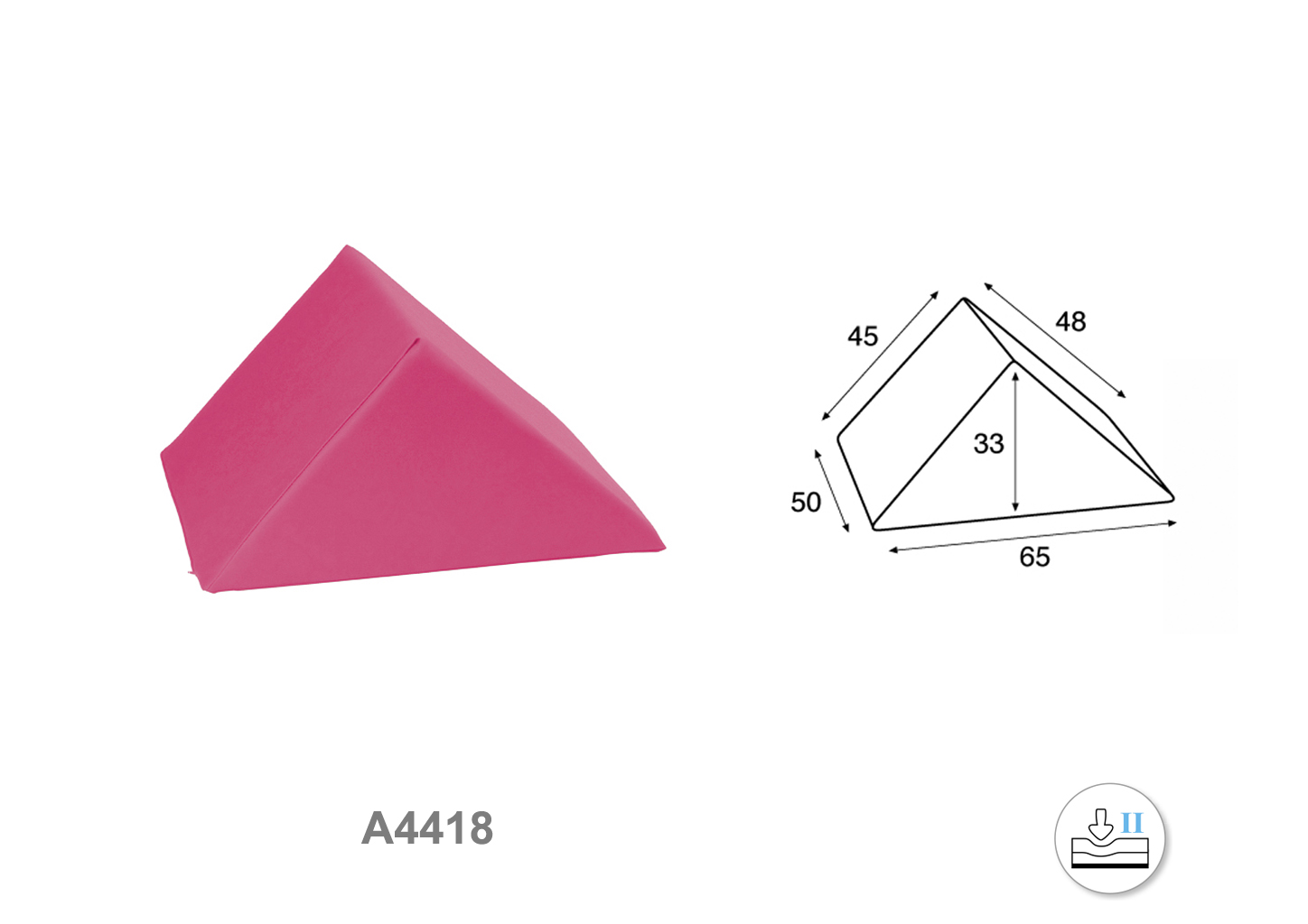 Cojín cuña grande de polipiel con forma triangular. Medidas: 65 cm de largo, 50 cm de ancho y 33 cm de alto.  Diagonales: 45 cm y 48 cm. Grado de firmeza media.