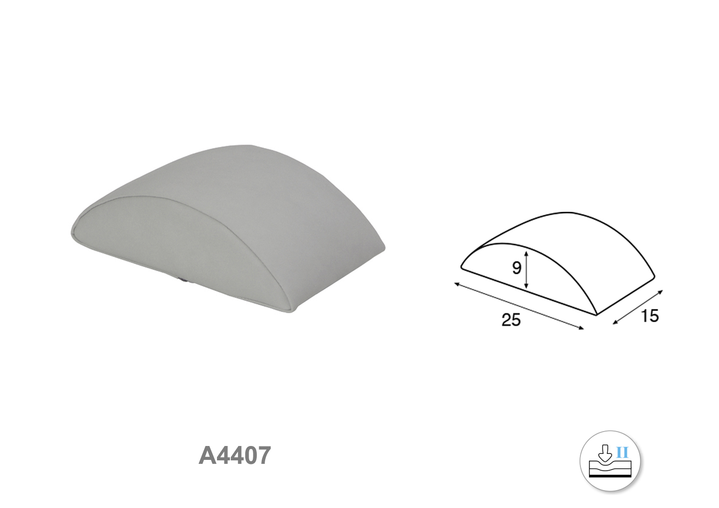 Cojín de polipiel con forma de media luna. Medidas: 25 cm de largo, 15 cm de ancho y 9 cm de alto.  Grado de firmeza media.
