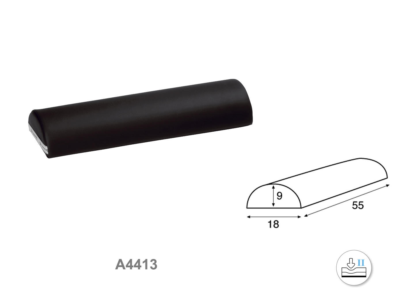 Cojín de polipiel con forma de medio cilindro. Medidas: 55 cm de largo, 18 cm de ancho y 9 cm de alto.  Grado de firmeza media.
