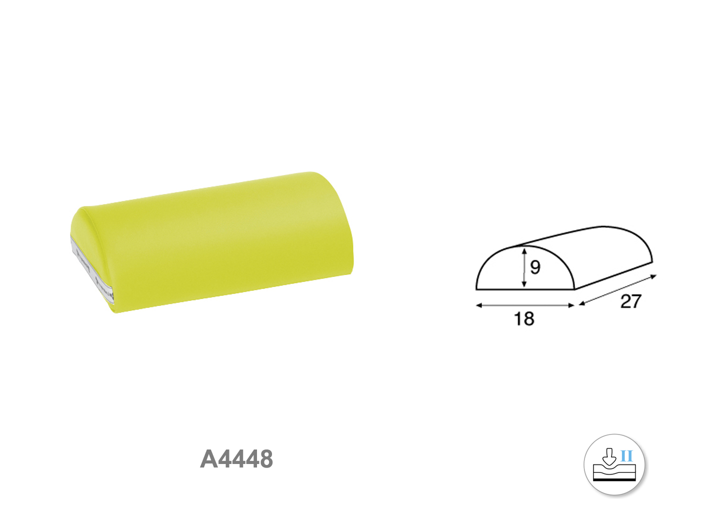 Cojín de polipiel con forma de medio cilindro. Medidas: 27 cm de largo, 18 cm de ancho y 9 cm de alto. Grado de firmeza media.