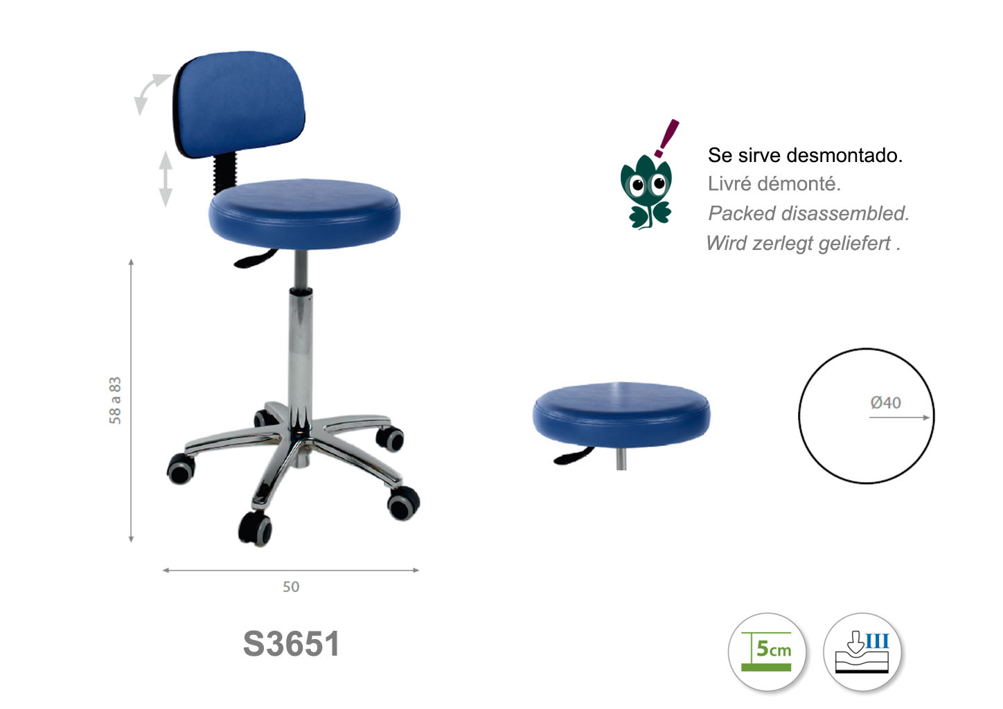 Asiento de 40 cm de diámetro. Firmeza semidura y espuma de 5 cm de grosor. Altura regulable de 58 cm a 83 cm.