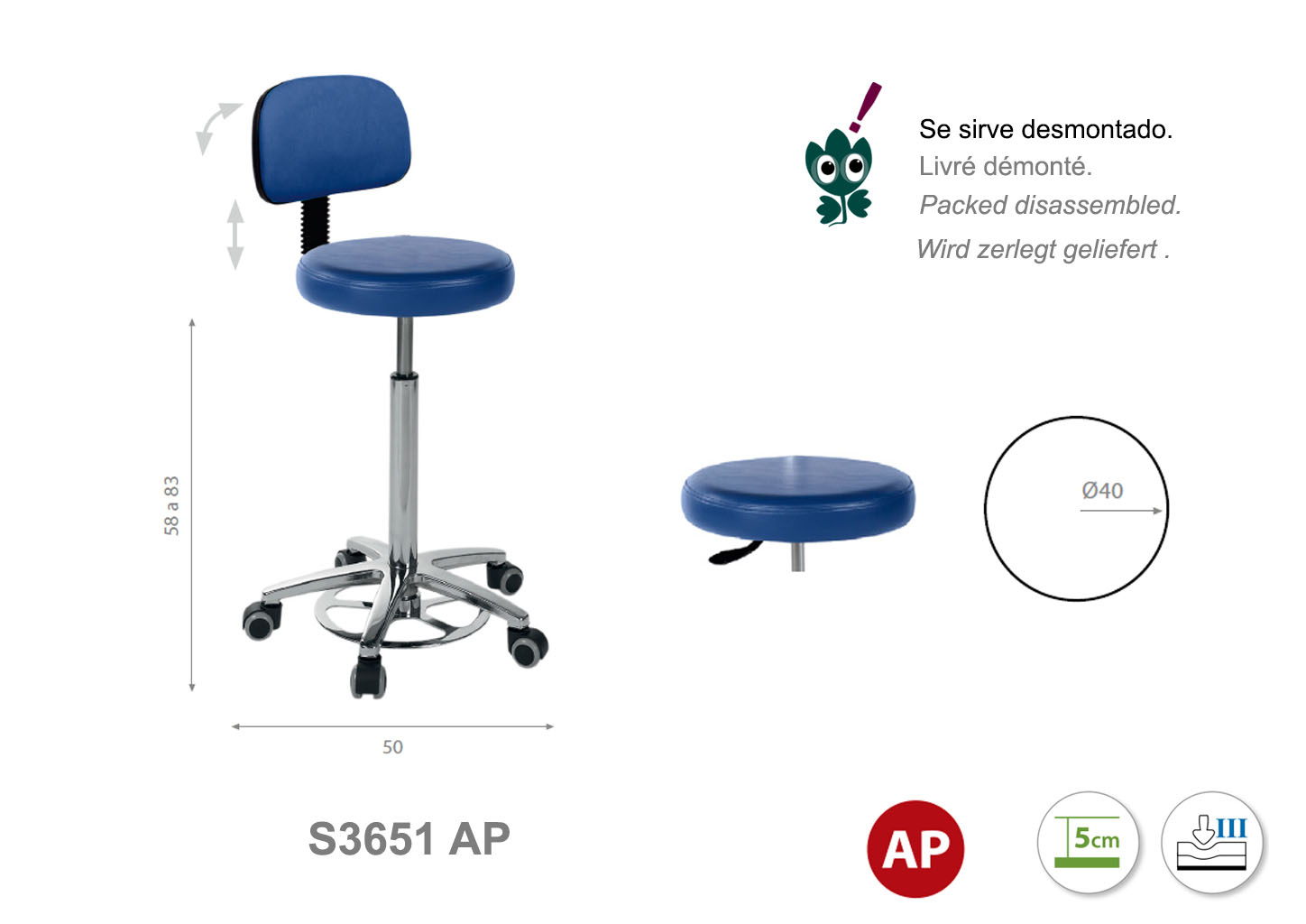 Asiento de 40 cm de diámetro. Firmeza semidura y espuma de 5 cm de grosor. Altura regulable de 58 cm a 83 cm.