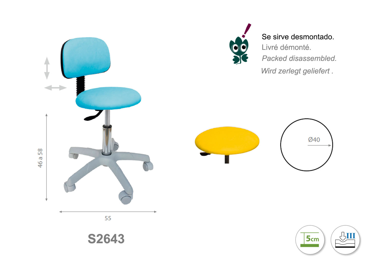 Asiento de 40 cm de diámetro. Firmeza semidura y espuma de 5 cm de grosor. Altura regulable de 46 cm a 58 cm.
