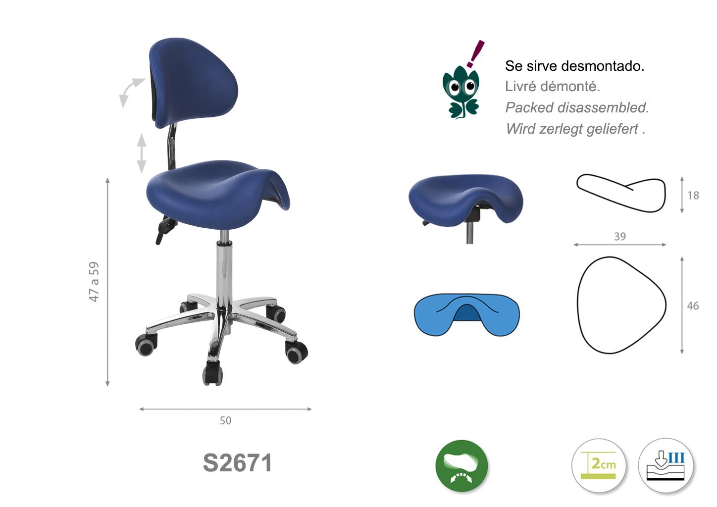 Firmeza semidura y espuma de 2 cm de grosor. Altura regulable de 47 cm a 59 cm.