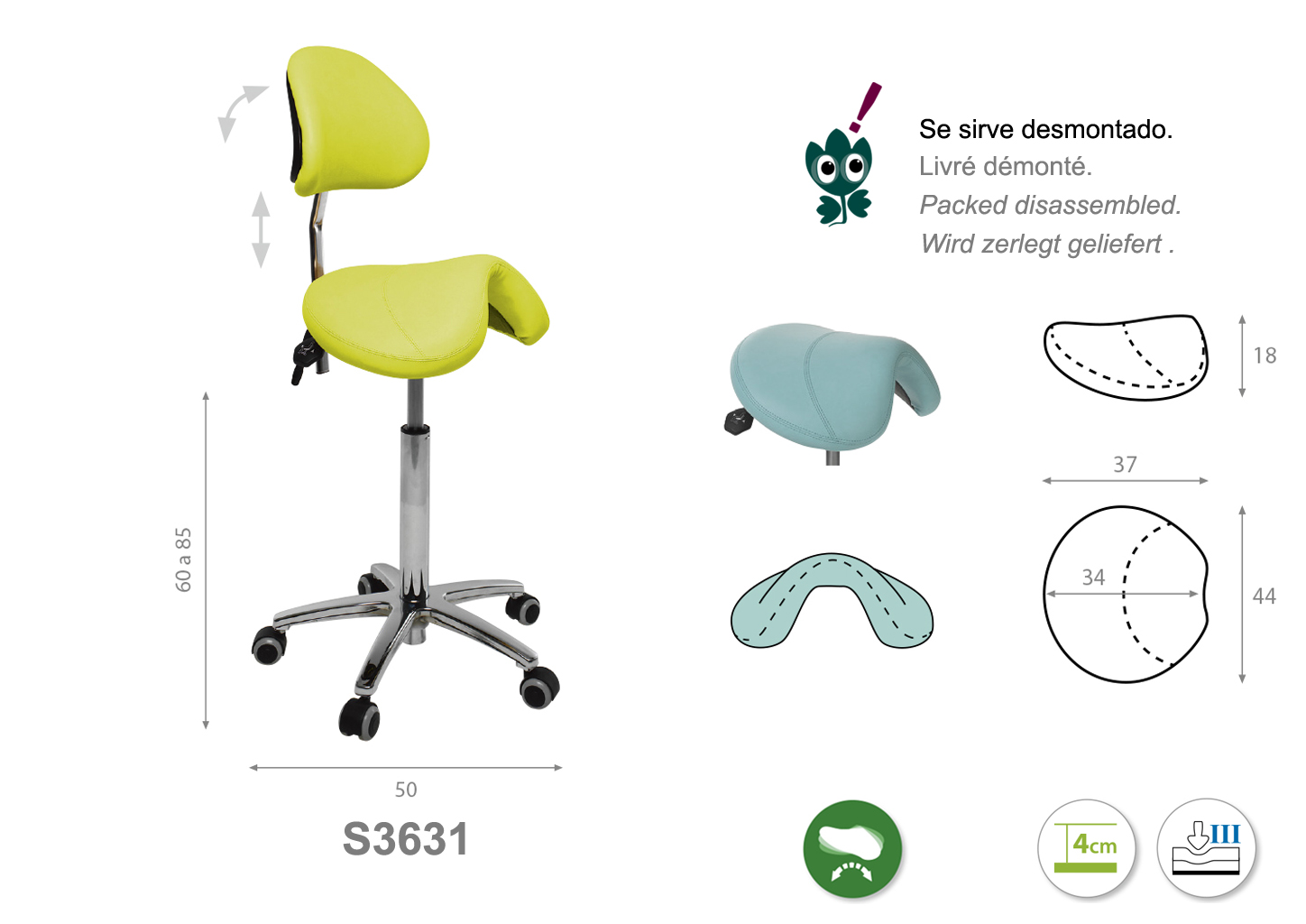 Silla con asiento basculante tipo pony de pistón largo y respaldo multi posición. Estructura metálica y base de aluminio.