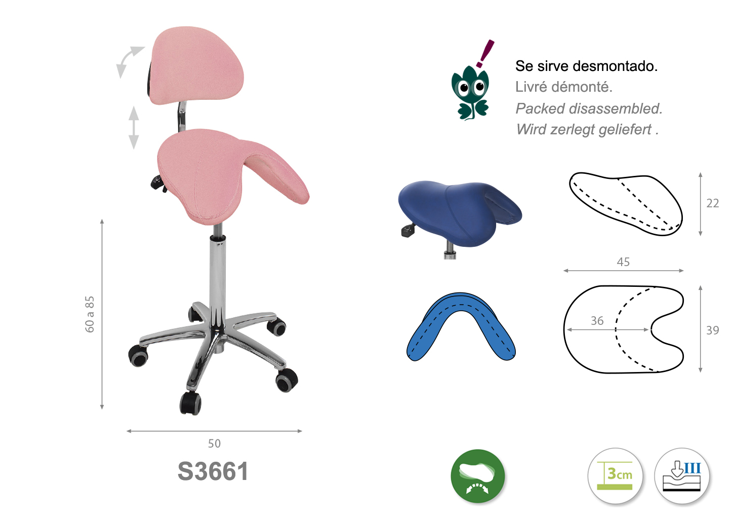 Firmeza semidura y espuma de 3 cm de grosor. Altura regulable de 60 cm a 85 cm.