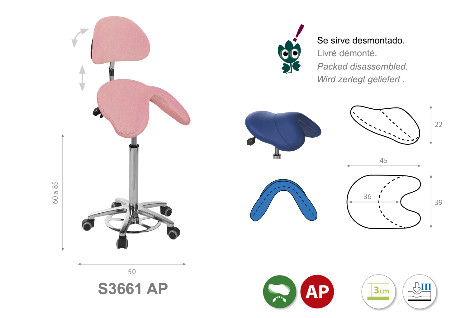 Firmeza semidura y espuma de 3 cm de grosor. Altura regulable de 60 cm a 85 cm.