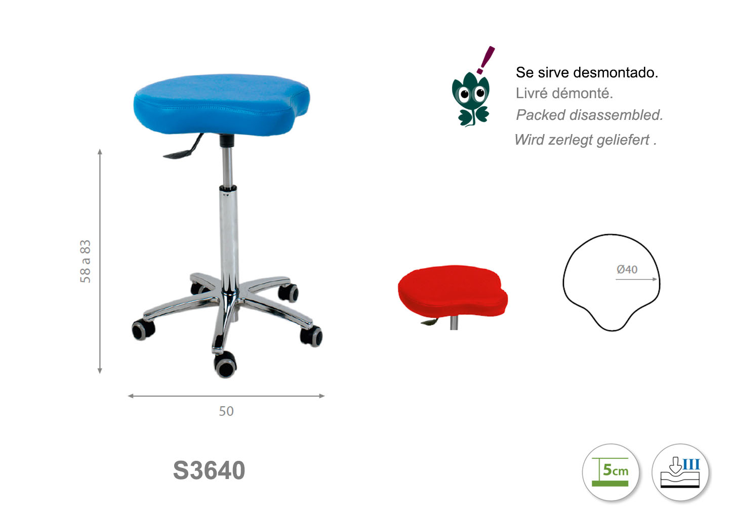 Asiento de 40 cm de diámetro. Firmeza semidura y espuma de 5 cm de grosor. Altura regulable de 58 cm a 83 cm.