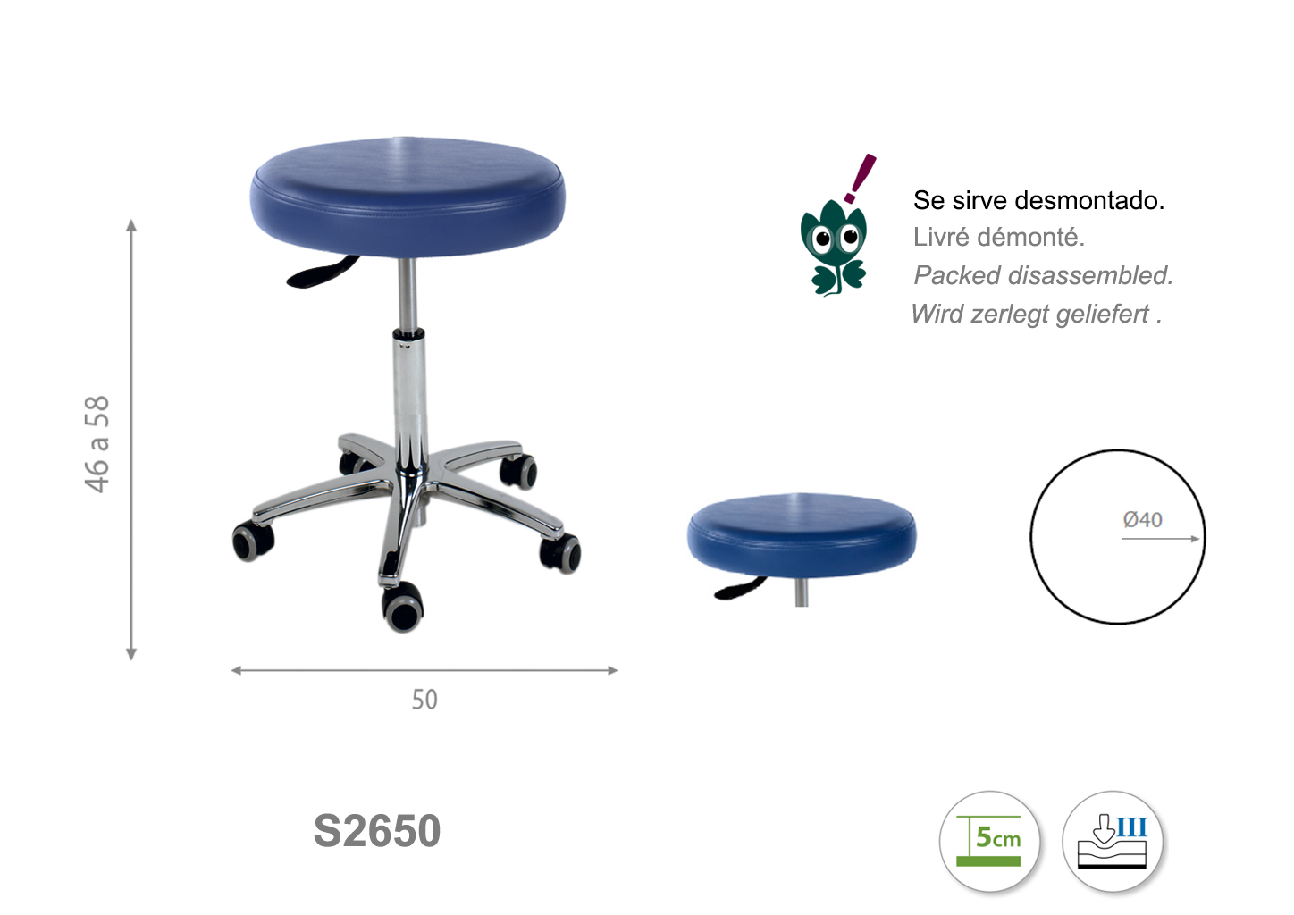 Asiento de 40 cm de diámetro. Firmeza semidura y espuma de 5 cm de grosor. Altura regulable de 46 cm a 58 cm.