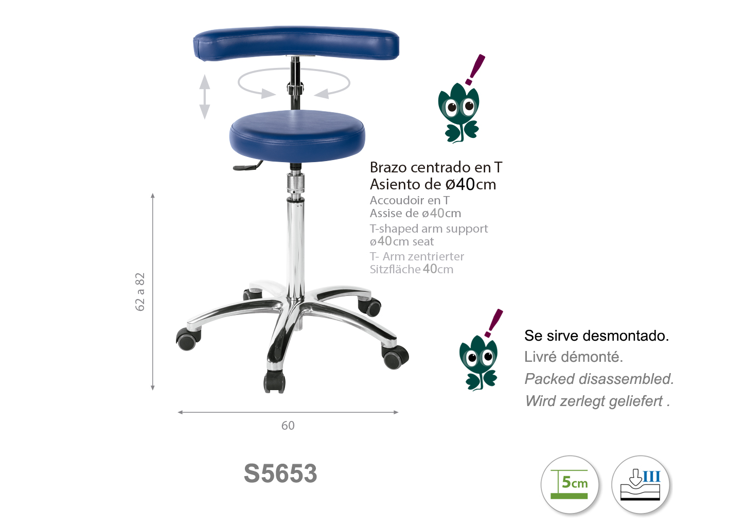 Asiento de 40 cm de diámetro. Firmeza semidura y espuma de 5 cm de grosor. Altura regulable de 62 cm a 82 cm.