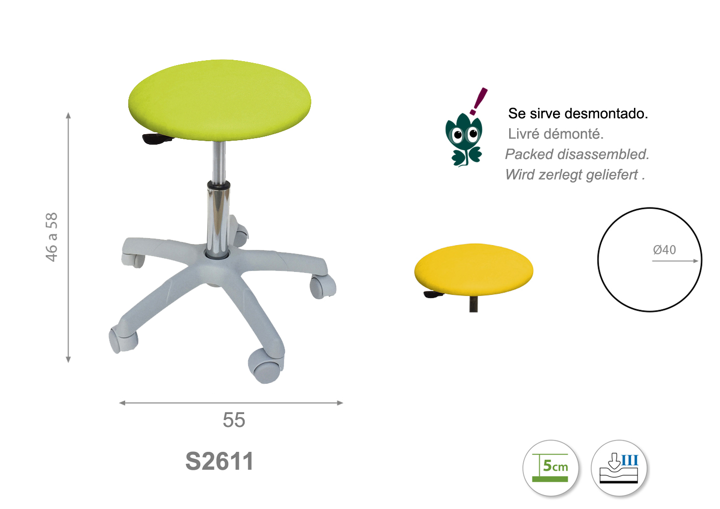 Asiento de 40 cm de diámetro. Firmeza semidura y espuma de 5 cm de grosor. Altura regulable de 46 cm a 58 cm.