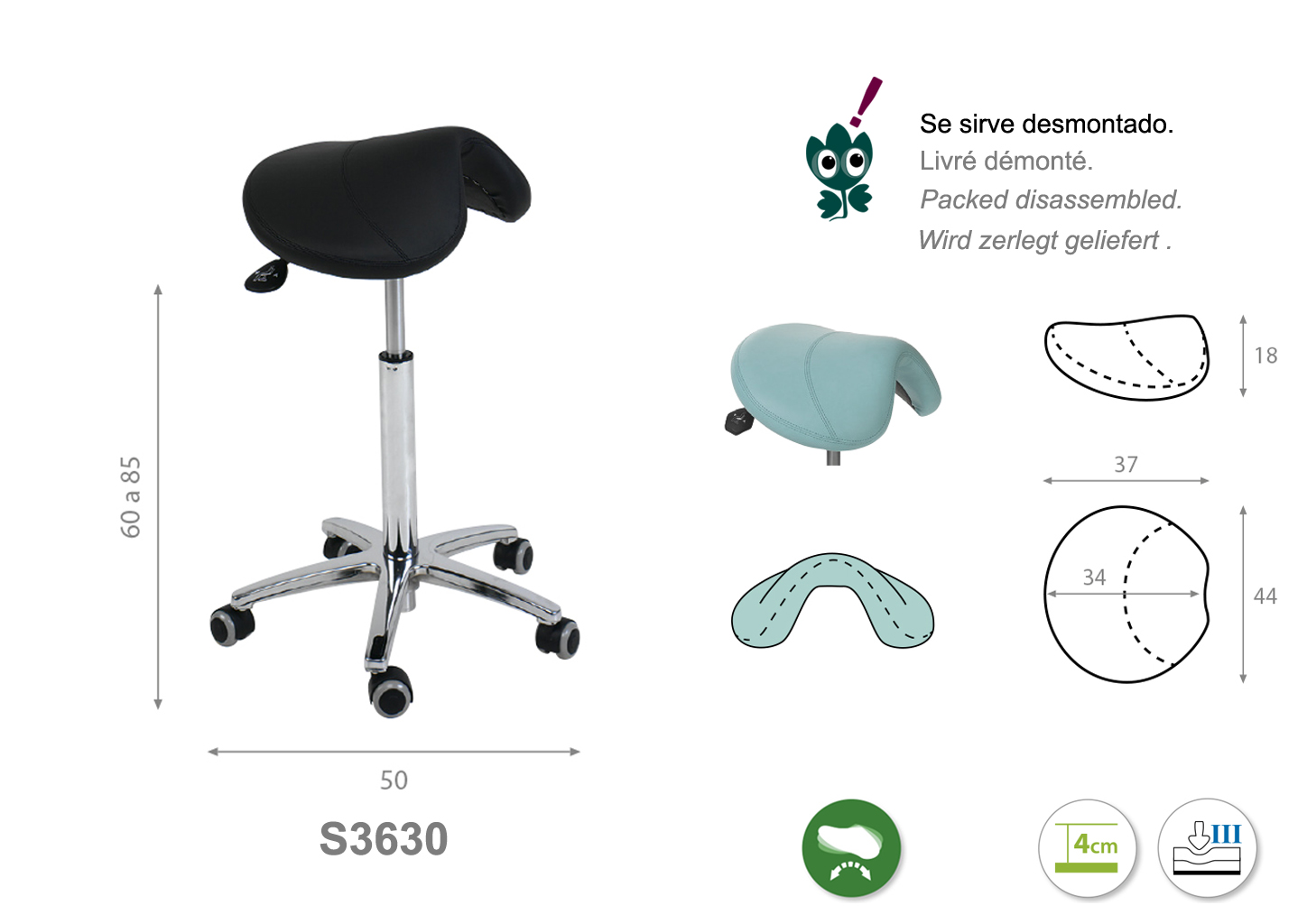 Taburete con asiento tipo pony basculante de pistón largo. Estructura metálica y base de aluminio.