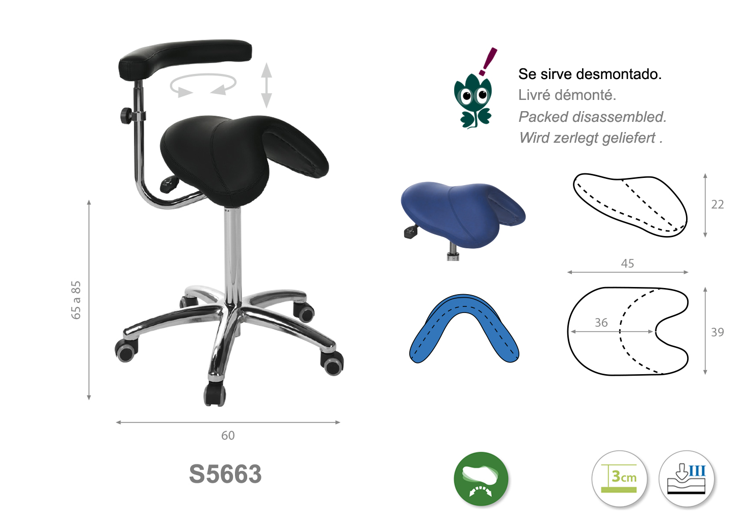 Firmeza semidura y espuma de 3 cm de grosor. Altura regulable de 65 cm a 85 cm.